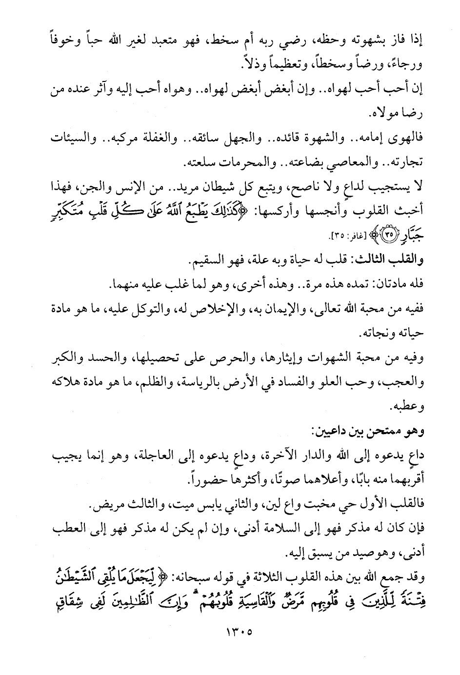 فالقلب الأول حي مخبت واع لين، والثاني يابس ميت، والثالث مريض.