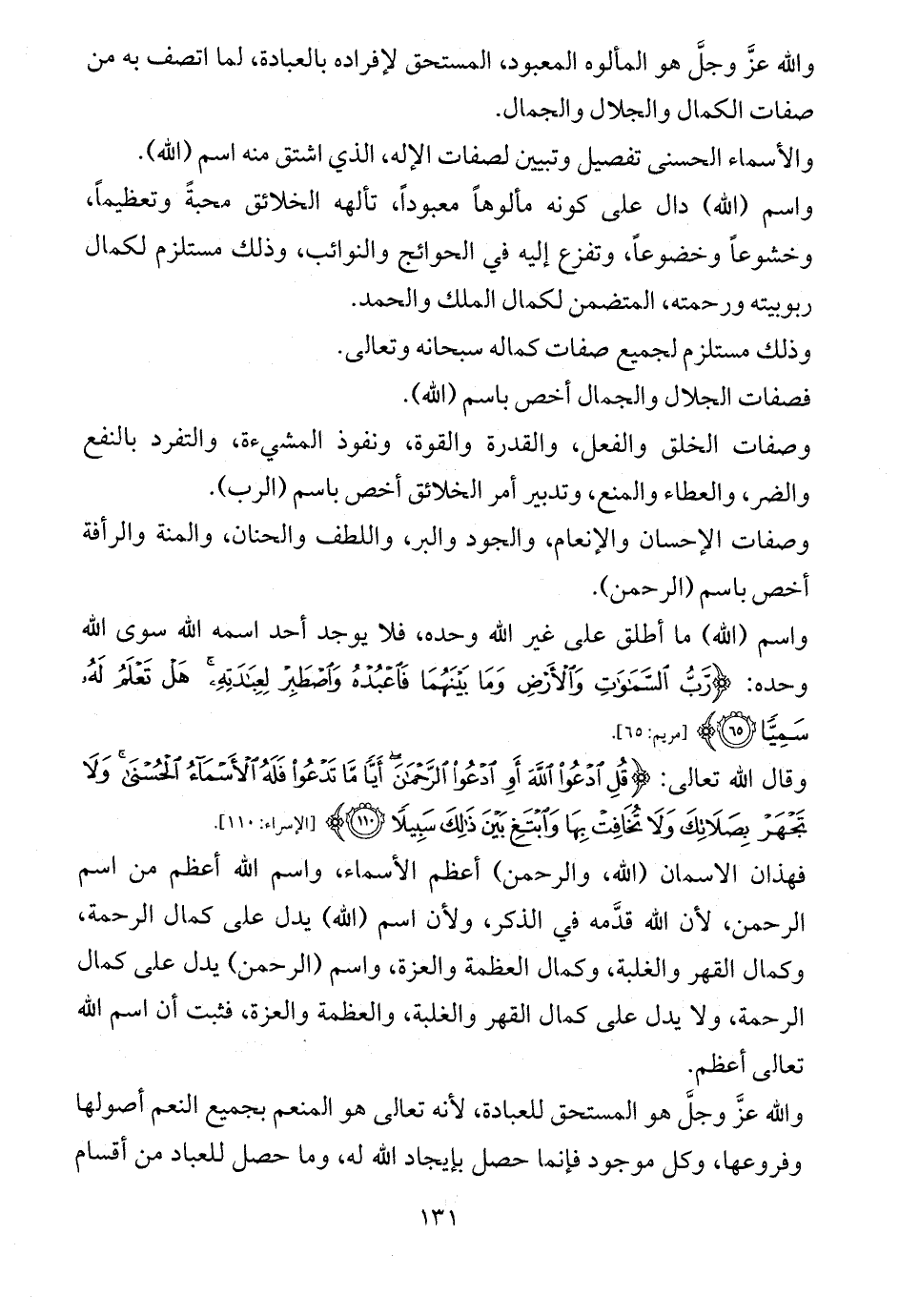 واسم (الله) دال على كونه مألوهاً معبوداً، تألهه الخلائق محبةً وتعظيماً، وخشوعاً وخضوعاً، وتفزع إليه في الحوائج والنوائب، وذلك مستلزم لكمال ربوبيته ورحمته، المتضمن لكمال الملك والحمد.