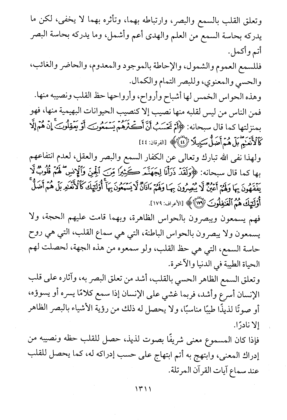 وتعلق القلب بالسمع والبصر، وارتباطه بهما، وتأثره بهما لا يخفى، لكن ما يدركه بحاسة السمع من العلم والهدى أعم وأشمل، وما يدركه بحاسة البصر أتم وأكمل.