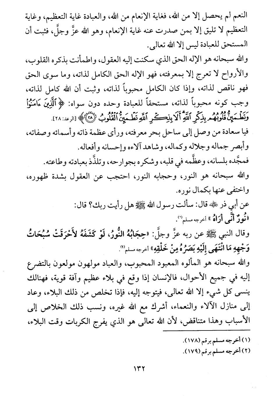 وقال النبي - صلى الله عليه وسلم - عن ربه عزَّ وجلَّ: «حِجَابُهُ النُّورُ، لَوْ كَشَفَهُ لأَحْرَقَتْ سُبُحَاتُ وَجْهِهِ مَا انْتَهَى إِلَيْهِ بَصَرُهُ مِنْ خَلْقِهِ» أخرجه مسلم (¬2).