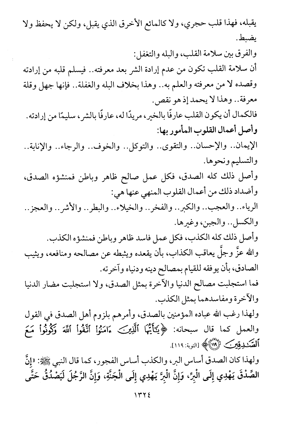فالكمال أن يكون القلب عارفًا بالخير، مريدًا له، عارفًا بالشر، سليمًا من إرادته.