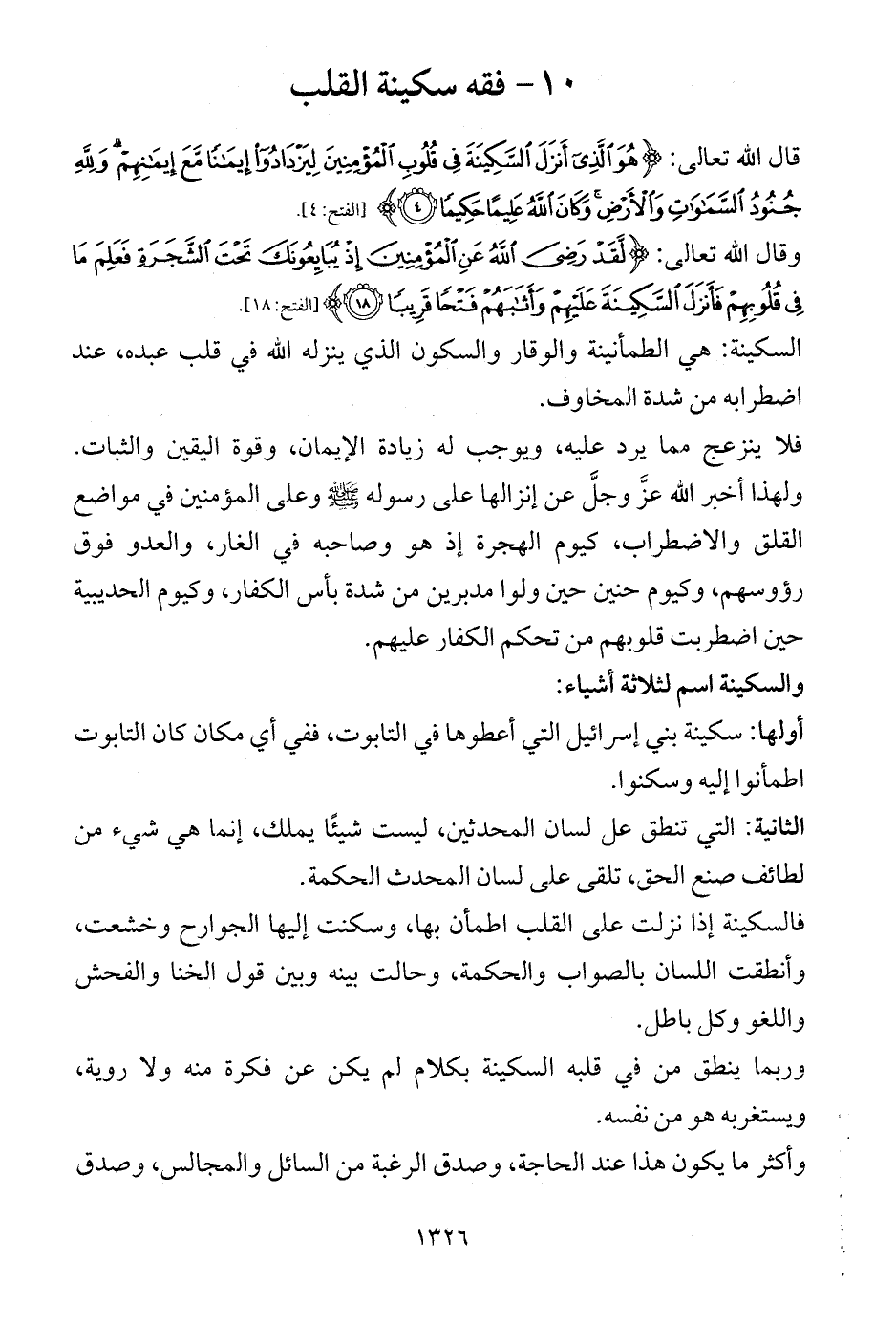 فالسكينة إذا نزلت على القلب اطمأن بها، وسكنت إليها الجوارح وخشعت، وأنطقت اللسان بالصواب والحكمة، وحالت بينه وبين قول الخنا والفحش واللغو وكل باطل.