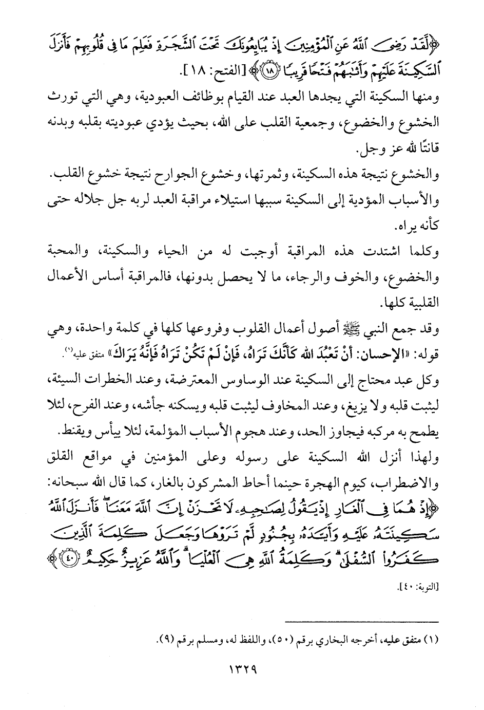 وقد جمع النبي - صلى الله عليه وسلم - أصول أعمال القلوب وفروعها كلها في كلمة واحدة، وهي قوله: «الإحسان: أنْ تَعْبُدَ الله كَأنَّكَ تَرَاهُ، فَإنْ لَمْ تَكُنْ تَرَاهُ فَإنَّهُ يَرَاكَ» متفق عليه (¬1).