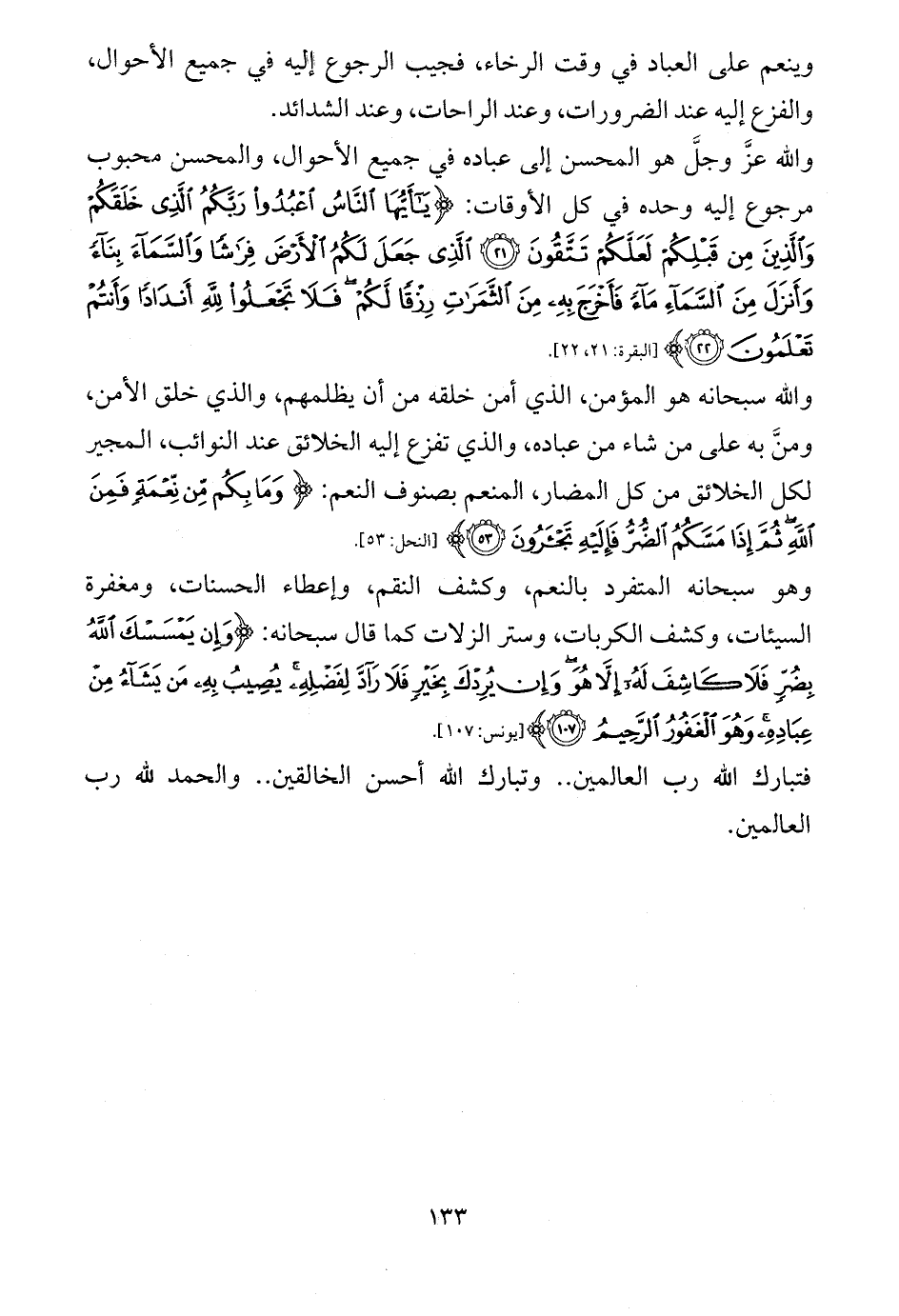 والله عزَّ وجلَّ هو المحسن إلى عباده في جميع الأحوال، والمحسن محبوب مرجوع إليه وحده في كل الأوقات: {يَاأَيُّهَا النَّاسُ اعْبُدُوا رَبَّكُمُ الَّذِي خَلَقَكُمْ وَالَّذِينَ مِنْ قَبْلِكُمْ لَعَلَّكُمْ تَتَّقُونَ (21) الَّذِي جَعَلَ لَكُمُ الْأَرْضَ فِرَاشًا وَالسَّمَاءَ بِنَاءً وَأَنْزَلَ مِنَ السَّمَاءِ مَاءً فَأَخْرَجَ بِهِ مِنَ الثَّمَرَاتِ رِزْقًا لَكُمْ فَلَا تَجْعَلُوا لِلَّهِ أَنْدَادًا وَأَنْتُمْ تَعْلَمُونَ (22)} [البقرة: 21، 22].
