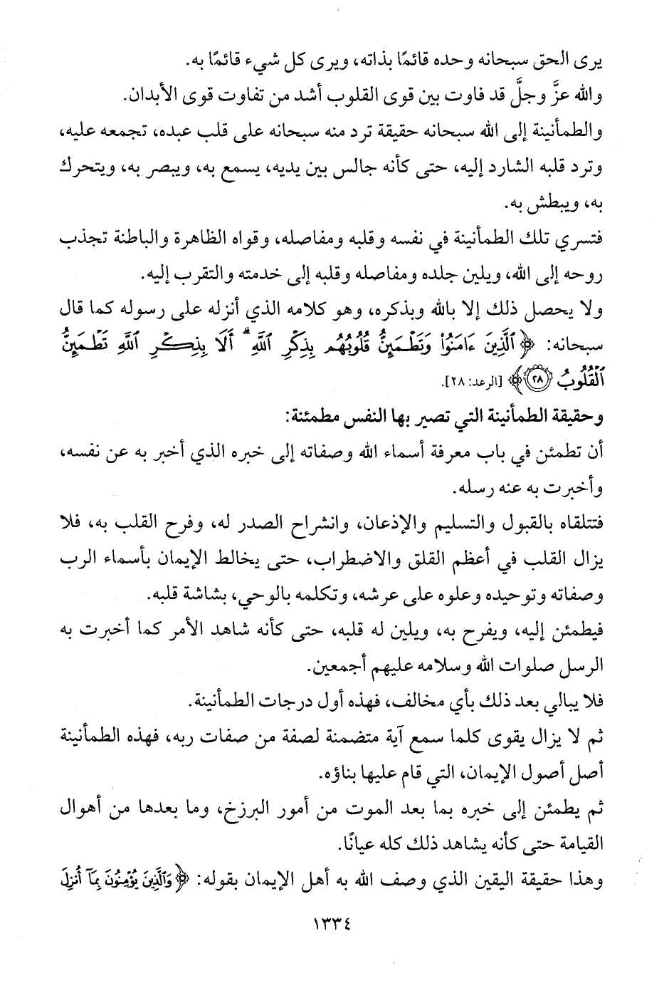 والطمأنينة إلى الله سبحانه حقيقة ترد منه سبحانه على قلب عبده، تجمعه عليه، وترد قلبه الشارد إليه، حتى كأنه جالس بين يديه، يسمع به، ويبصر به، ويتحرك به، ويبطش به.