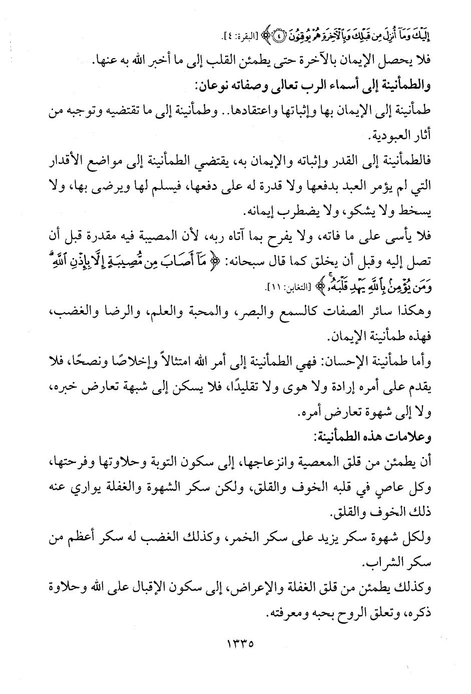 وأما طمأنينة الإحسان: فهي الطمأنينة إلى أمر الله امتثالاً وإخلاصًا ونصحًا، فلا يقدم على أمره إرادة ولا هوى ولا تقليدًا، فلا يسكن إلى شبهة تعارض خبره، ولا إلى شهوة تعارض أمره.