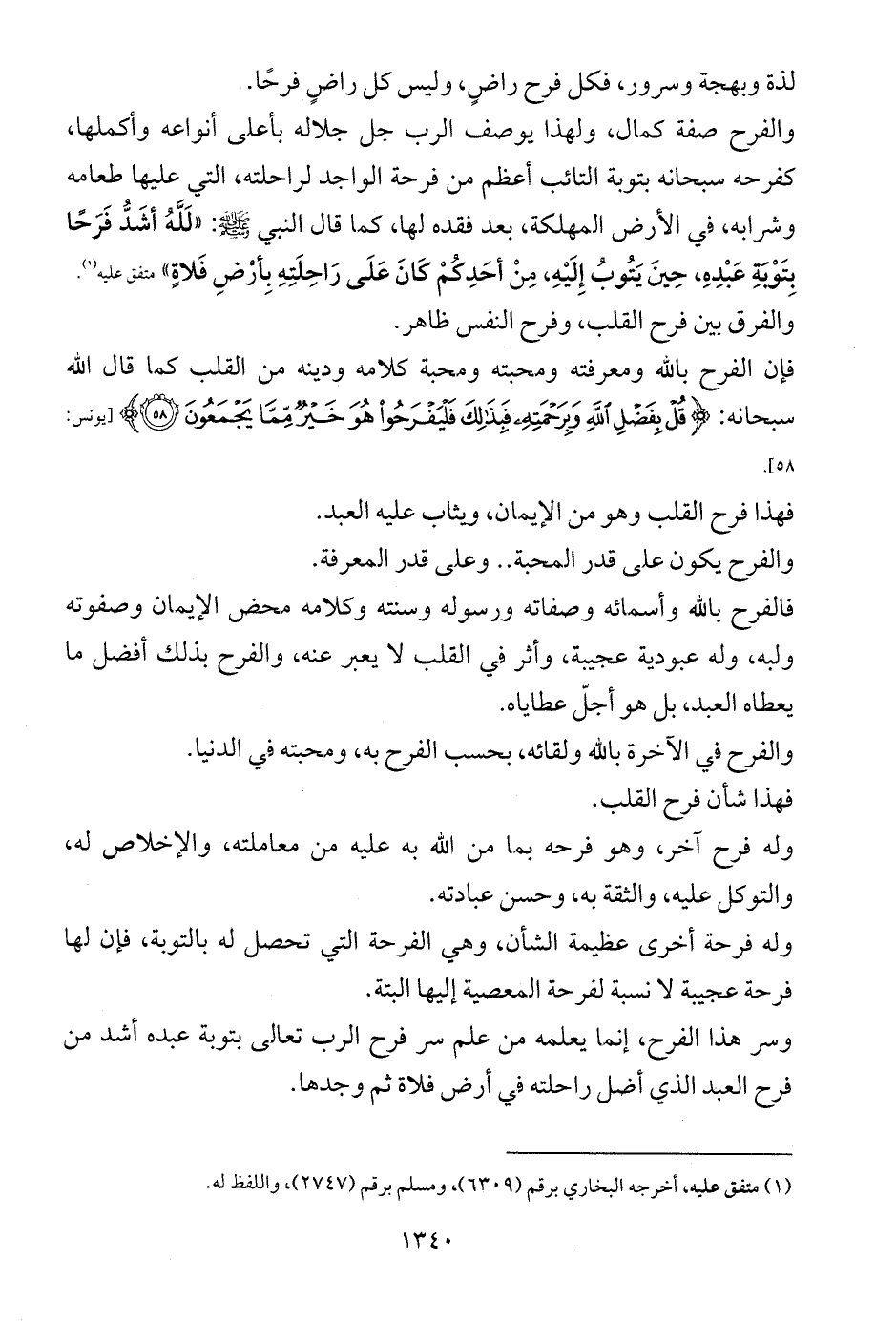 والفرح صفة كمال، ولهذا يوصف الرب جل جلاله بأعلى أنواعه وأكملها، كفرحه سبحانه بتوبة التائب أعظم من فرحة الواجد لراحلته، التي عليها طعامه وشرابه، في الأرض المهلكة، بعد فقده لها، كما قال النبي - صلى الله عليه وسلم -: «لَلَّهُ أشَدُّ فَرَحًا بِتَوْبَةِ عَبْدِهِ، حِينَ يَتُوبُ إِلَيْهِ، مِنْ أحَدِكُمْ كَانَ عَلَى رَاحِلَتِهِ بِأرْضِ فَلاةٍ» متفق عليه (¬1).