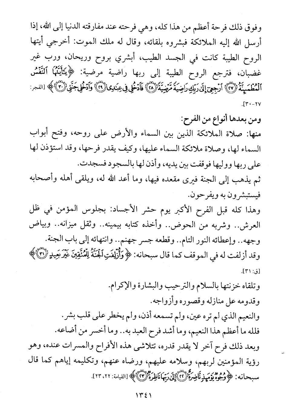 وفوق ذلك فرحة أعظم من هذا كله، وهي فرحته عند مفارقته الدنيا إلى الله، إذا أرسل الله إليه الملائكة فبشروه بلقائه، وقال له ملك الموت: أخرجي أيتها الروح الطيبة كانت في الجسد الطيب، أبشري بروح وريحان، ورب غير غضبان، فترجع الروح الطيبة إلى ربها راضية مرضية: {يَاأَيَّتُهَا النَّفْسُ الْمُطْمَئِنَّةُ (27) ارْجِعِي إِلَى رَبِّكِ رَاضِيَةً مَرْضِيَّةً (28) فَادْخُلِي فِي عِبَادِي (29) وَادْخُلِي جَنَّتِي (30)} [الفجر: 27 - 30].