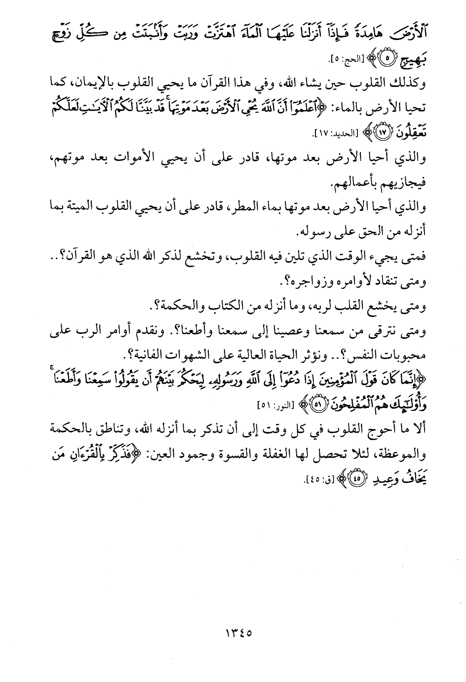 وكذلك القلوب حين يشاء الله، وفي هذا القرآن ما يحيي القلوب بالإيمان، كما تحيا الأرض بالماء: {اعْلَمُوا أَنَّ اللَّهَ يُحْيِ الْأَرْضَ بَعْدَ مَوْتِهَا قَدْ بَيَّنَّا لَكُمُ الْآيَاتِ لَعَلَّكُمْ تَعْقِلُونَ (17)} [الحديد: 17].