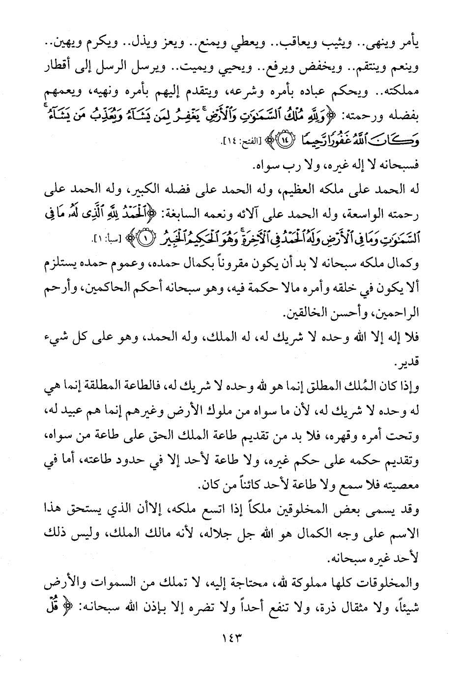 وكمال ملكه سبحانه لا بد أن يكون مقروناً بكمال حمده، وعموم حمده يستلزم ألا يكون في خلقه وأمره مالا حكمة فيه، وهو سبحانه أحكم الحاكمين، وأرحم الراحمين، وأحسن الخالقين.