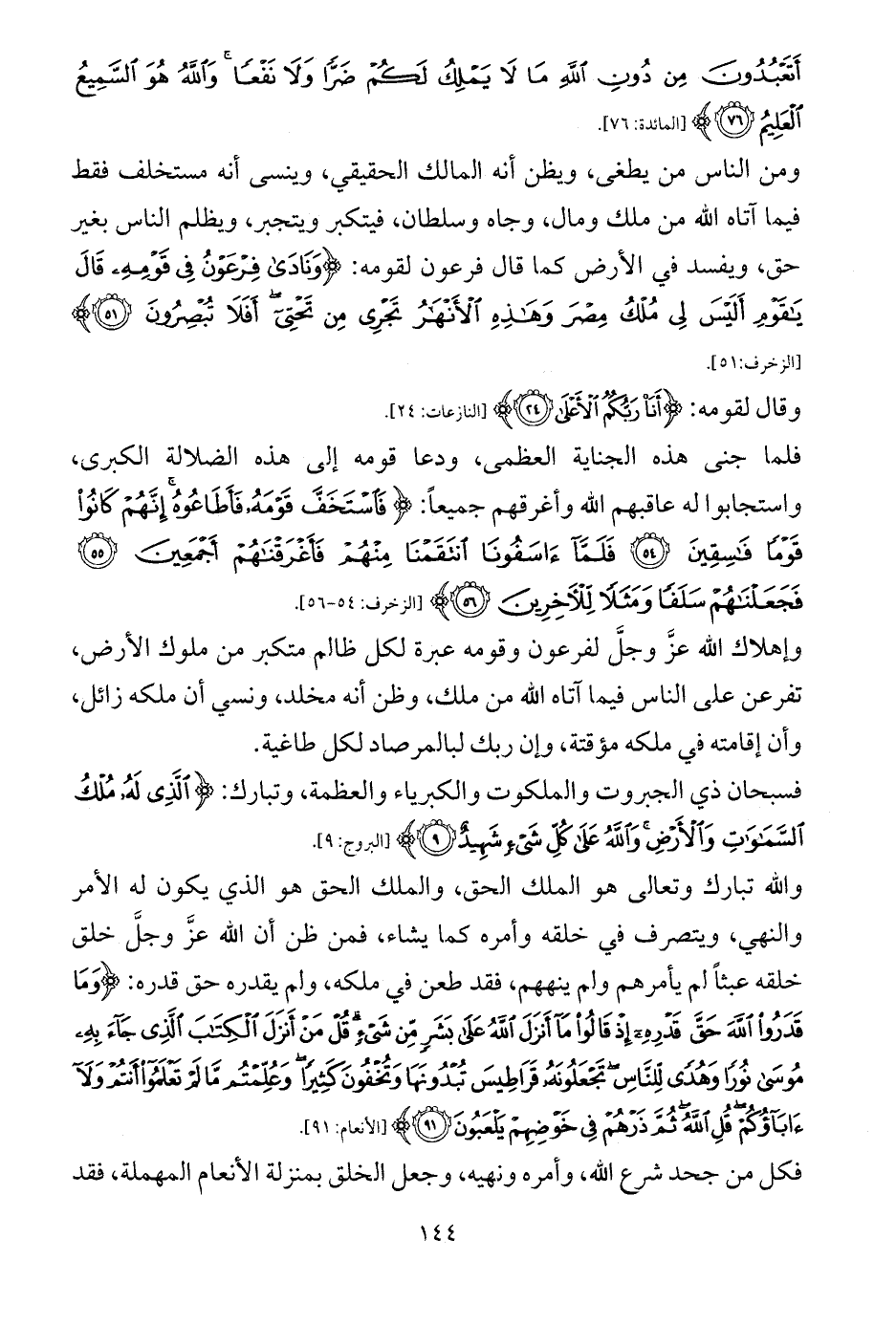 والله تبارك وتعالى هو الملك الحق، والملك الحق هو الذي يكون له الأمر والنهي، ويتصرف في خلقه وأمره كما يشاء، فمن ظن أن الله عزَّ وجلَّ خلق خلقه عبثاً لم يأمرهم ولم ينههم، فقد طعن في ملكه، ولم يقدره حق قدره: {وَمَا قَدَرُوا اللَّهَ حَقَّ قَدْرِهِ إِذْ قَالُوا مَا أَنْزَلَ اللَّهُ عَلَى بَشَرٍ مِنْ شَيْءٍ قُلْ مَنْ أَنْزَلَ الْكِتَابَ الَّذِي جَاءَ بِهِ مُوسَى نُورًا وَهُدًى لِلنَّاسِ تَجْعَلُونَهُ قَرَاطِيسَ تُبْدُونَهَا وَتُخْفُونَ كَثِيرًا وَعُلِّمْتُمْ مَا لَمْ تَعْلَمُوا أَنْتُمْ وَلَا آبَاؤُكُمْ قُلِ اللَّهُ ثُمَّ ذَرْهُمْ فِي خَوْضِهِمْ يَلْعَبُونَ (91)} [الأنعام: 91].