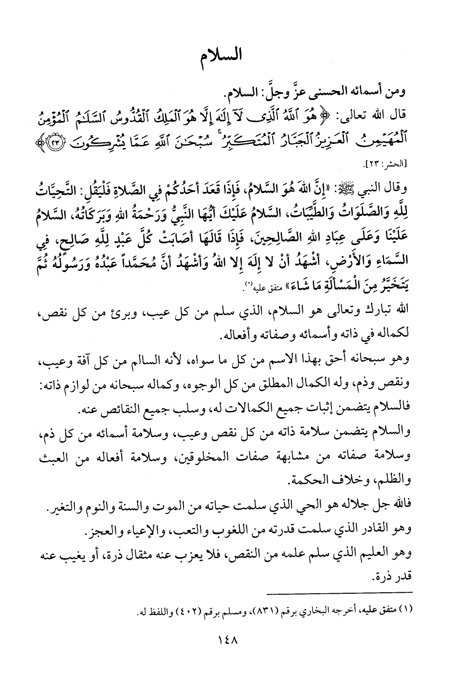 والسلام يتضمن سلامة ذاته من كل نقص وعيب، وسلامة أسمائه من كل ذم، وسلامة صفاته من مشابهة صفات المخلوقين، وسلامة أفعاله من العبث والظلم، وخلاف الحكمة.