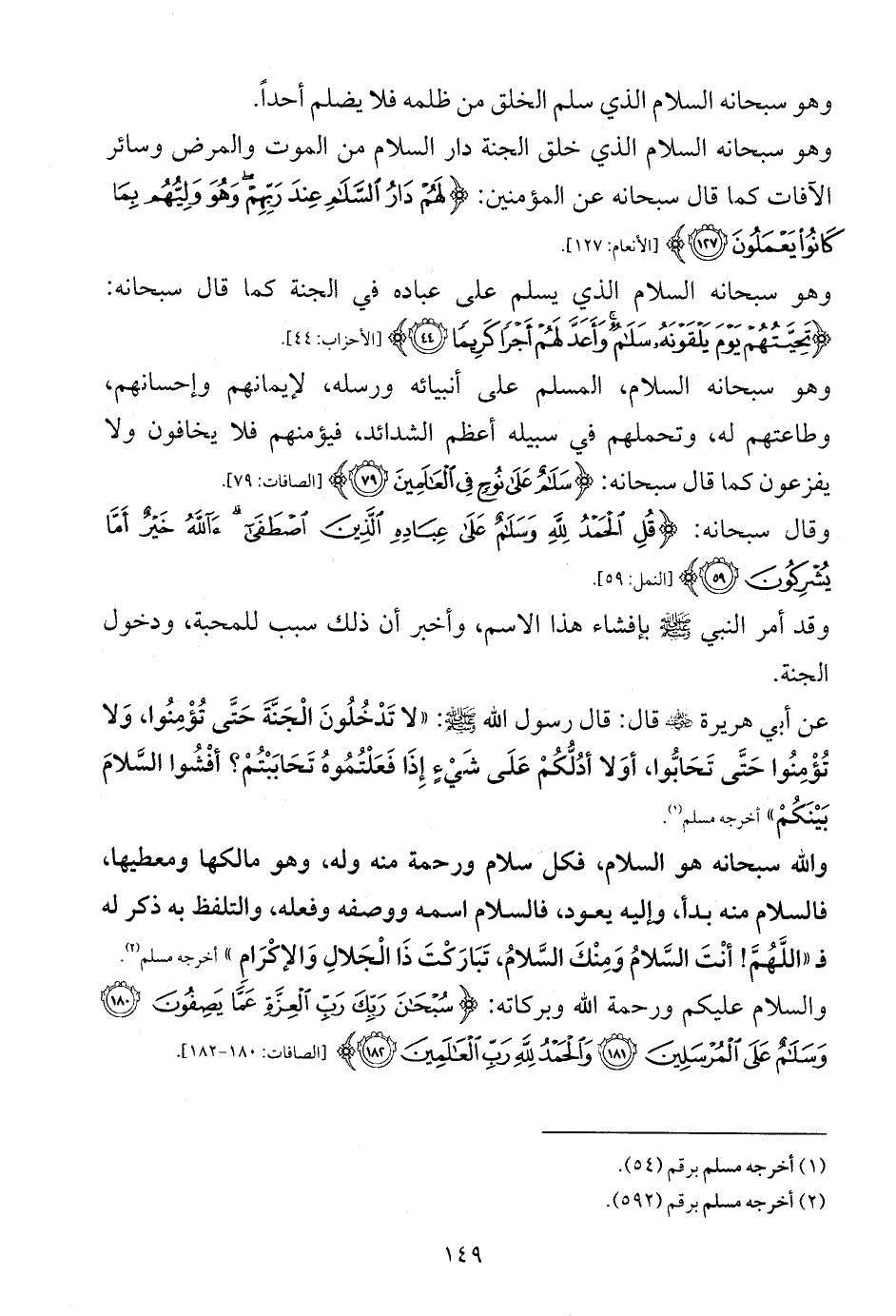 والله سبحانه هو السلام، فكل سلام ورحمة منه وله، وهو مالكها ومعطيها، فالسلام منه بدأ، وإليه يعود، فالسلام اسمه ووصفه وفعله، والتلفظ به ذكر له فـ «اللَّهُمَّ! أنْتَ السَّلامُ وَمِنْكَ السَّلامُ، تَبَارَكْتَ ذَا الْجَلالِ وَالإكْرَامِ» أخرجه مسلم (¬2).