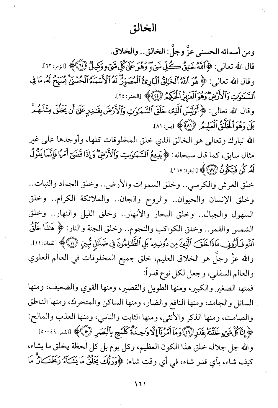 خلق العرش والكرسي .. وخلق السموات والأرض .. وخلق الجماد والنبات .. وخلق الإنسان والحيوان .. والروح والجان .. والملائكة الكرام .. وخلق السهول والجبال .. وخلق البحار والأنهار .. وخلق الليل والنهار .. وخلق الشمس والقمر .. وخلق الكواكب والنجوم .. وخلق الجنة والنار: {هَذَا خَلْقُ اللَّهِ فَأَرُونِي مَاذَا خَلَقَ الَّذِينَ مِنْ دُونِهِ بَلِ الظَّالِمُونَ فِي ضَلَالٍ مُبِينٍ (11)} [لقمان: 11].
