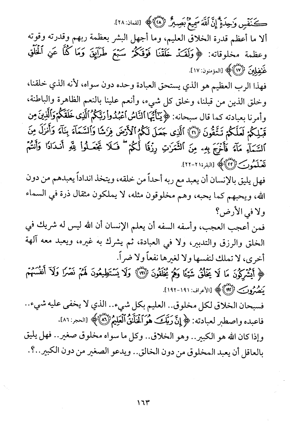 فهذا الرب العظيم هو الذي يستحق العبادة وحده دون سواه، لأنه الذي خلقنا، وخلق الذين من قبلنا، وخلق كل شيء، وأنعم علينا بالنعم الظاهرة والباطنة، وأمرنا بعبادته كما قال سبحانه: {يَاأَيُّهَا النَّاسُ اعْبُدُوا رَبَّكُمُ الَّذِي خَلَقَكُمْ وَالَّذِينَ مِنْ قَبْلِكُمْ لَعَلَّكُمْ تَتَّقُونَ (21) الَّذِي جَعَلَ لَكُمُ الْأَرْضَ فِرَاشًا وَالسَّمَاءَ بِنَاءً وَأَنْزَلَ مِنَ السَّمَاءِ مَاءً فَأَخْرَجَ بِهِ مِنَ الثَّمَرَاتِ رِزْقًا لَكُمْ فَلَا تَجْعَلُوا لِلَّهِ أَنْدَادًا وَأَنْتُمْ تَعْلَمُونَ (22)} [البقرة21 - 22].