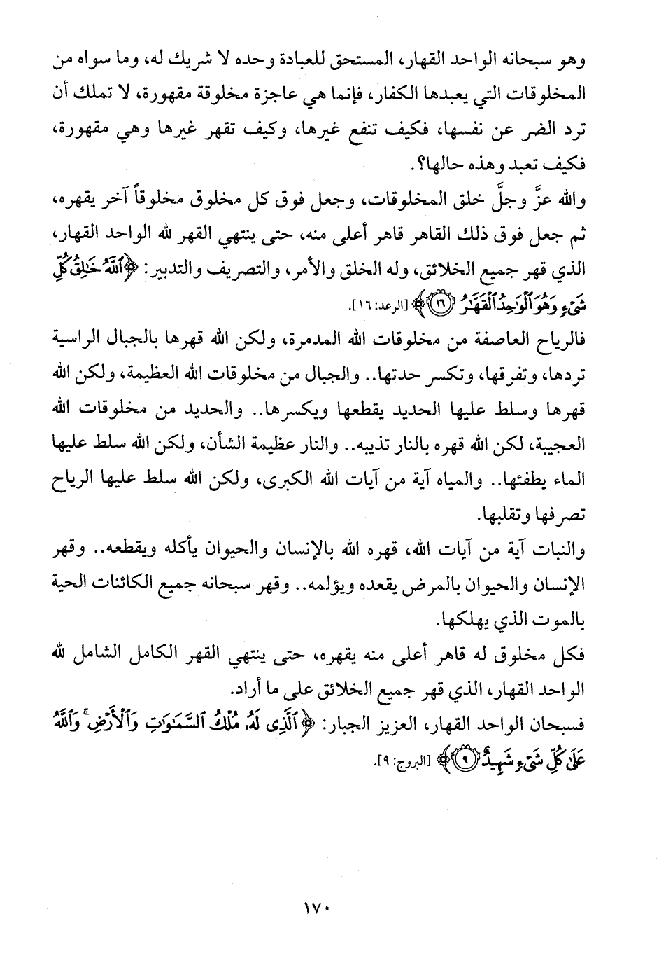 وهو سبحانه الواحد القهار، المستحق للعبادة وحده لا شريك له، وما سواه من المخلوقات التي يعبدها الكفار، فإنما هي عاجزة مخلوقة مقهورة، لا تملك أن ترد الضر عن نفسها، فكيف تنفع غيرها، وكيف تقهر غيرها وهي مقهورة، فكيف تعبد وهذه حالها؟.