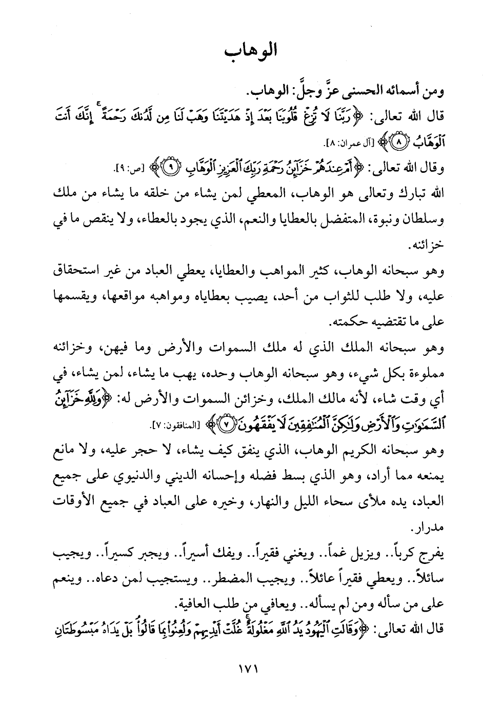 وهو سبحانه الوهاب، كثير المواهب والعطايا، يعطي العباد من غير استحقاق عليه، ولا طلب للثواب من أحد، يصيب بعطاياه ومواهبه مواقعها، ويقسمها على ما تقتضيه حكمته.