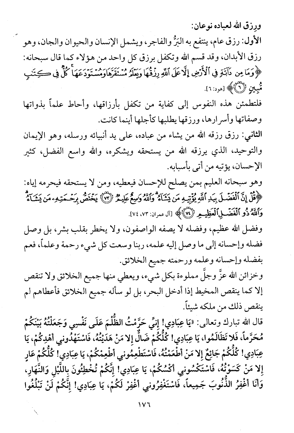 قال الله تبارك وتعالى: «يَا عِبَادِي! إِنِّي حَرَّمْتُ الظُّلْمَ عَلَى نَفْسِي وَجَعَلْتُهُ بَيْنَكُمْ مُحَرَّماً، فَلا تَظَالَمُوا، يَا عِبَادِي! كُلُّكُمْ ضَالٌّ إِلا مَنْ هَدَيْتُهُ، فَاسْتَهْدُونِي أهْدِكُمْ، يَا عِبَادِي! كُلُّكُمْ جَائِعٌ إِلا مَنْ أطْعَمْتُهُ، فَاسْتَطْعِمُونِي أطْعِمْكُمْ، يَا عِبَادِي! كُلُّكُمْ عَارٍ إِلا مَنْ كَسَوْتُهُ، فَاسْتَكْسُونِي أكْسُكُمْ، يَا عِبَادِي! إِنَّكُمْ تُخْطِئُونَ بِاللَّيْلِ وَالنَّهَارِ، وَأنَا أغْفِرُ الذُّنُوبَ جَمِيعاً، فَاسْتَغْفِرُونِي أغْفِرْ لَكُمْ، يَا عِبَادِي! إِنَّكُمْ لَنْ تَبْلُغُوا