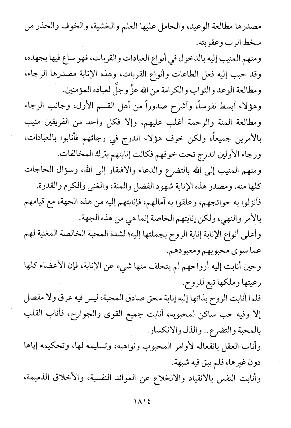 وهؤلاء أبسط نفوساً، وأشرح صدوراً من أهل القسم الأول، وجانب الرجاء ومطالعة المنة والرحمة أغلب عليهم، وإلا فكل واحد من الفريقين منيب بالأمرين جميعاً، ولكن خوف هؤلاء اندرج في رجائهم فأنابوا بالعبادات، ورجاء الأولين اندرج تحت خوفهم فكانت إنابتهم بترك المخالفات.