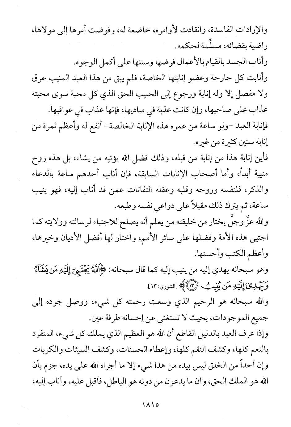 وأنابت كل جارحة وعضو إنابتها الخاصة، فلم يبق من هذا العبد المنيب عرق ولا مفصل إلا وله إنابة ورجوع إلى الحبيب الحق الذي كل محبة سوى محبته عذاب على صاحبها، وإن كانت عذبة في مباديها، فإنها عذاب في عواقبها.