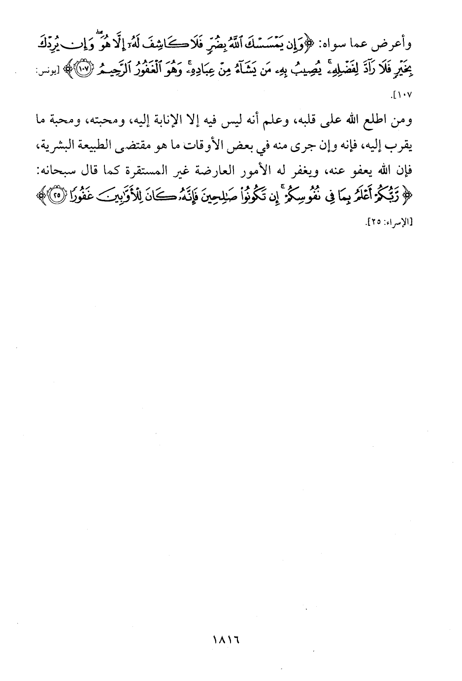 ومن اطلع الله على قلبه، وعلم أنه ليس فيه إلا الإنابة إليه، ومحبته، ومحبة ما يقرب إليه، فإنه وإن جرى منه في بعض الأوقات ما هو مقتضى الطبيعة البشرية، فإن الله يعفو عنه، ويغفر له الأمور العارضة غير المستقرة كما قال سبحانه: {رَبُّكُمْ أَعْلَمُ بِمَا فِي نُفُوسِكُمْ إِنْ تَكُونُوا صَالِحِينَ فَإِنَّهُ كَانَ لِلْأَوَّابِينَ غَفُورًا (25)} [الإسراء: 25].