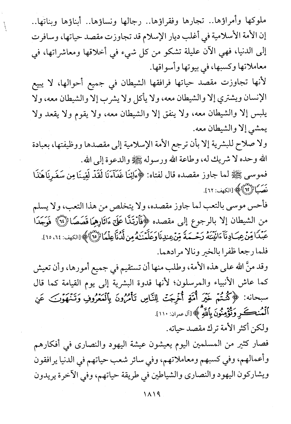 إن الأمة الأسلامية في أغلب ديار الإسلام قد تجاوزت مقصد حياتها، وسافرت إلى الدنيا، فهي الآن عليلة تشكو من كل شيء في أخلاقها ومعاشراتها، في معاملاتها وكسبها، في بيوتها وأسواقها.