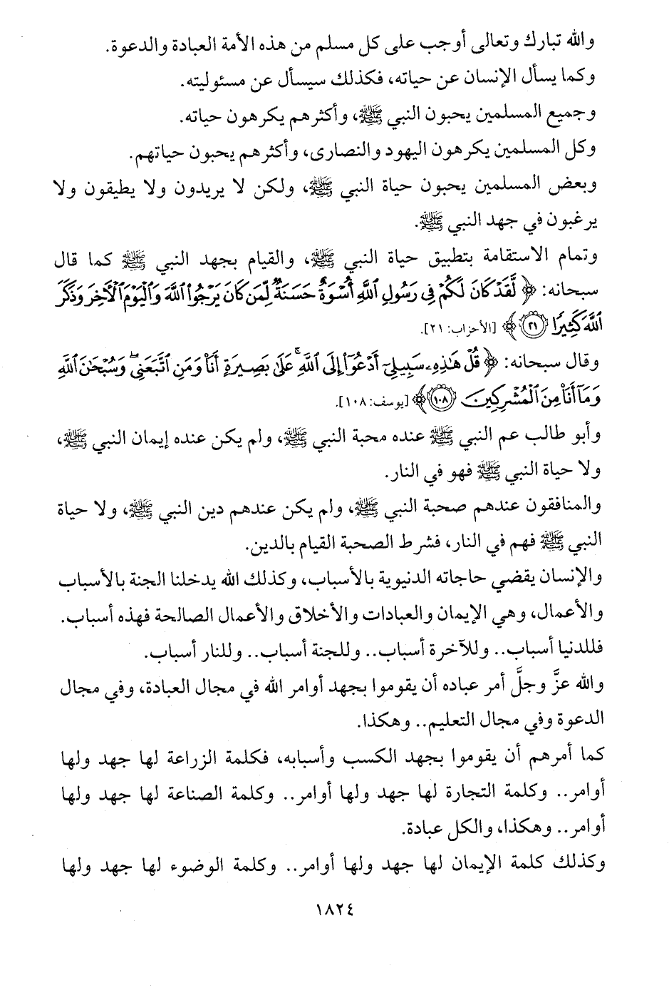وتمام الاستقامة بتطبيق حياة النبي - صلى الله عليه وسلم -، والقيام بجهد النبي - صلى الله عليه وسلم - كما قال سبحانه: {لَقَدْ كَانَ لَكُمْ فِي رَسُولِ اللَّهِ أُسْوَةٌ حَسَنَةٌ لِمَنْ كَانَ يَرْجُو اللَّهَ وَالْيَوْمَ الْآخِرَ وَذَكَرَ اللَّهَ كَثِيرًا (21)} [الأحزاب: 21].