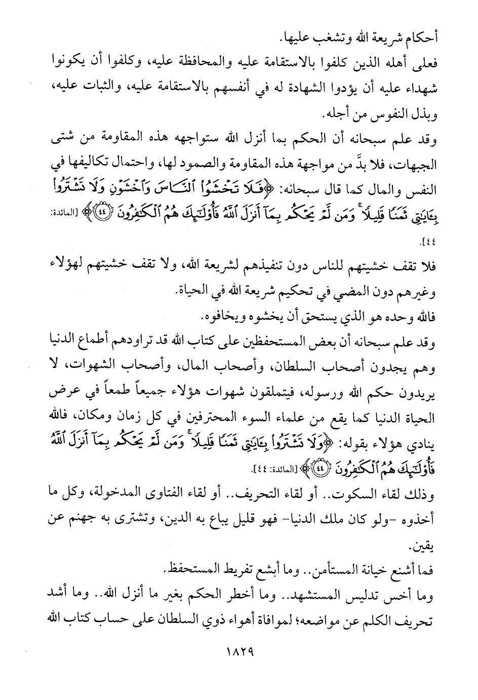 وقد علم سبحانه أن بعض المستحفظين على كتاب الله قد تراودهم أطماع الدنيا وهم يجدون أصحاب السلطان، وأصحاب المال، وأصحاب الشهوات، لا يريدون حكم الله ورسوله، فيتملقون شهوات هؤلاء جميعاً طمعاً في عرض الحياة الدنيا كما يقع من علماء السوء المحترفين في كل زمان ومكان، فالله ينادي هؤلاء بقوله: {وَلَا تَشْتَرُوا بِآيَاتِي ثَمَنًا قَلِيلًا وَمَنْ لَمْ يَحْكُمْ بِمَا أَنْزَلَ اللَّهُ فَأُولَئِكَ هُمُ الْكَافِرُونَ (44)} [المائدة: 44].