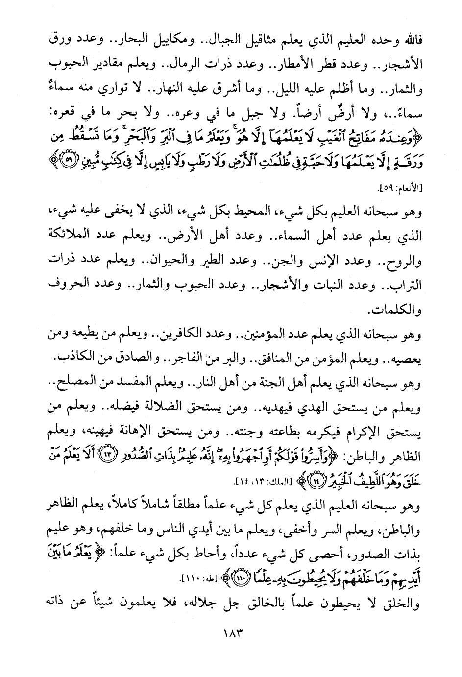 فالله وحده العليم الذي يعلم مثاقيل الجبال .. ومكاييل البحار .. وعدد ورق الأشجار .. وعدد قطر الأمطار .. وعدد ذرات الرمال .. ويعلم مقادير الحبوب والثمار .. وما أظلم عليه الليل .. وما أشرق عليه النهار .. لا تواري منه سماءٌ سماءً .. ، ولا أرضٌ أرضاً. ولا جبل ما في وعره .. ولا بحر ما في قعره: {وَعِنْدَهُ مَفَاتِحُ الْغَيْبِ لَا يَعْلَمُهَا إِلَّا هُوَ وَيَعْلَمُ مَا فِي الْبَرِّ وَالْبَحْرِ وَمَا تَسْقُطُ مِنْ وَرَقَةٍ إِلَّا يَعْلَمُهَا وَلَا حَبَّةٍ فِي ظُلُمَاتِ الْأَرْضِ وَلَا رَطْبٍ وَلَا يَابِسٍ إِلَّا فِي كِتَابٍ مُبِينٍ (59)} [الأنعام: 59].