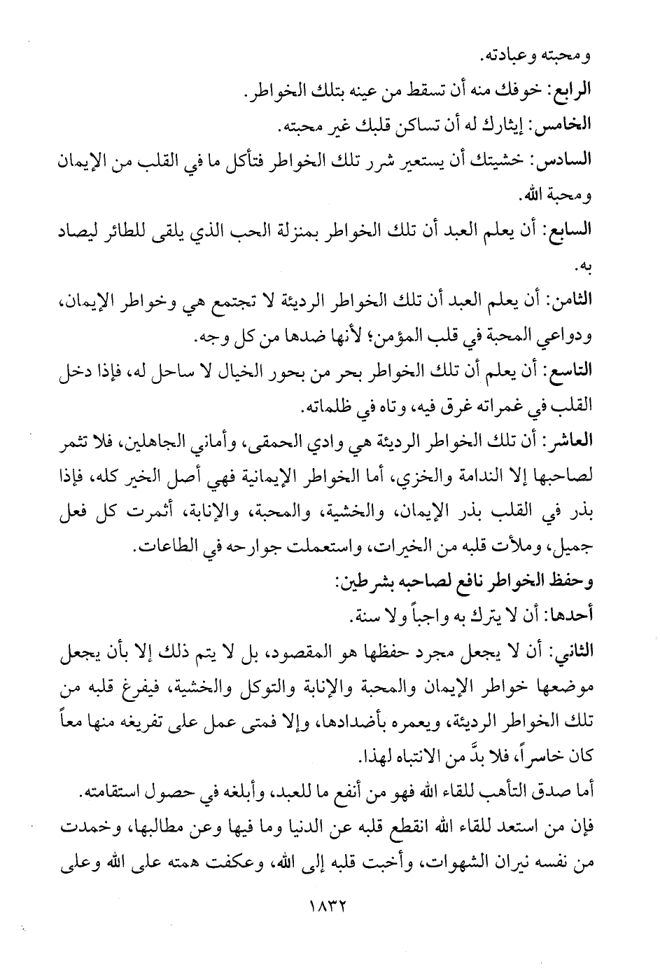 الثاني: أن لا يجعل مجرد حفظها هو المقصود، بل لا يتم ذلك إلا بأن يجعل موضعها خواطر الإيمان والمحبة والإنابة والتوكل والخشية، فيفرغ قلبه من تلك الخواطر الرديئة، ويعمره بأضدادها، وإلا فمتى عمل على تفريغه منها معاً كان خاسراً، فلا بدَّ من الانتباه لهذا.