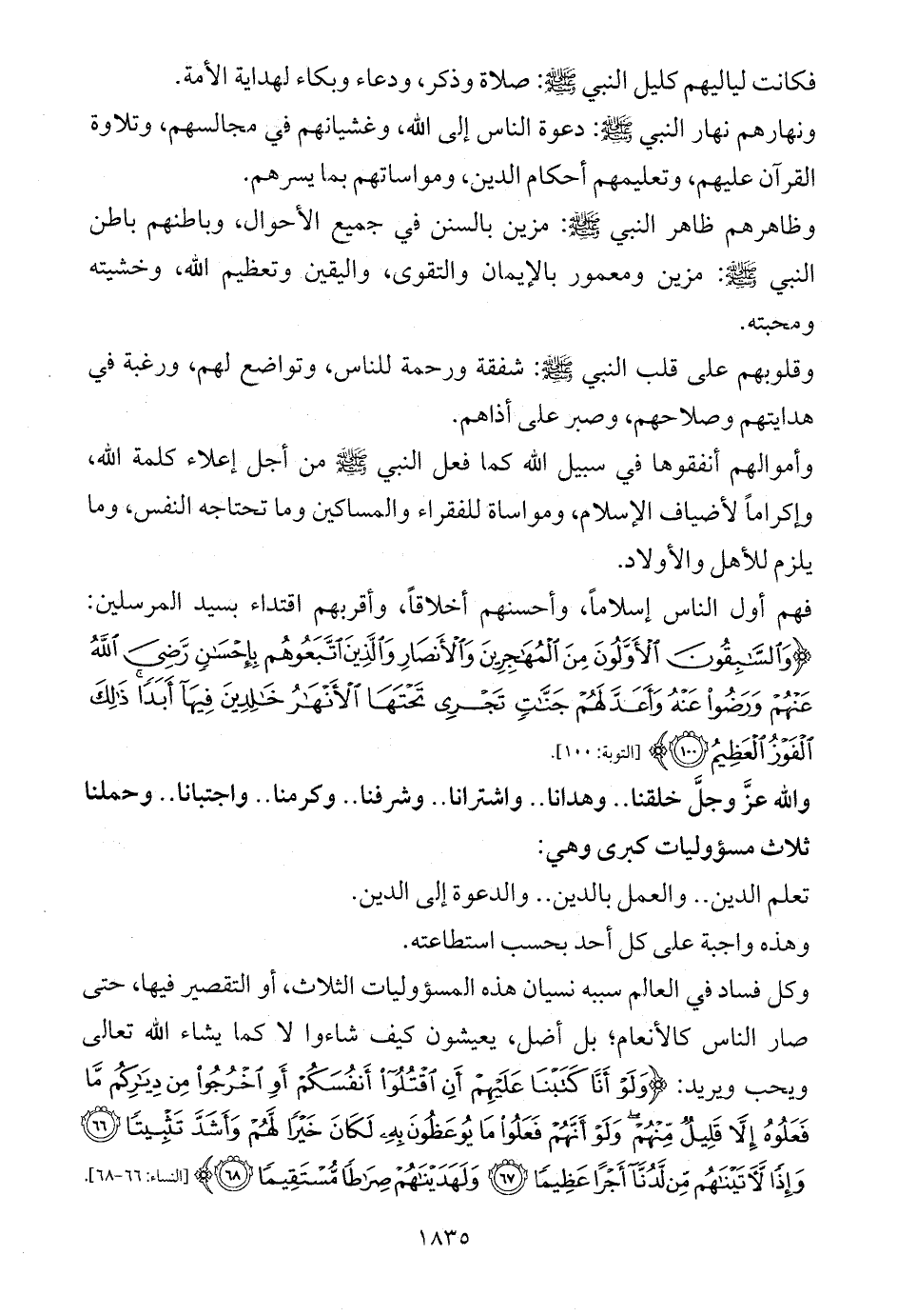 ونهارهم نهار النبي - صلى الله عليه وسلم -: دعوة الناس إلى الله، وغشيانهم في مجالسهم، وتلاوة القرآن عليهم، وتعليمهم أحكام الدين، ومواساتهم بما يسرهم.