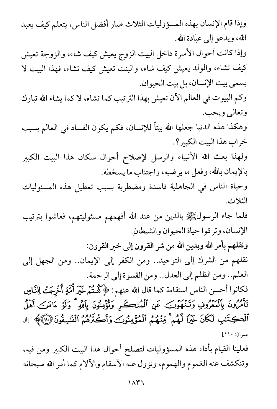 وإذا قام الإنسان بهذه المسؤوليات الثلاث صار أفضل الناس، يتعلم كيف يعبد الله، ويدعو إلى عبادة الله.