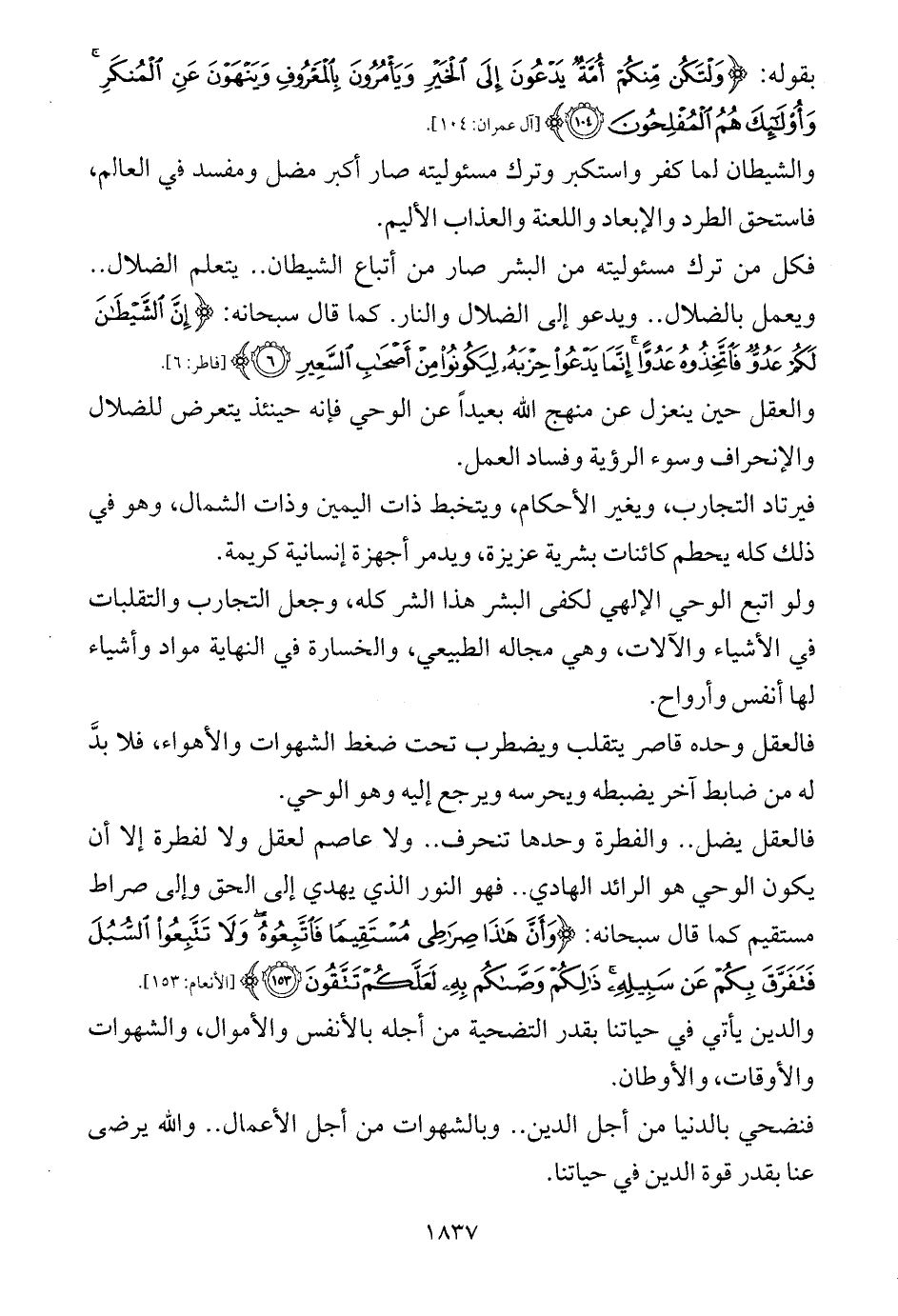 والدين يأتي في حياتنا بقدر التضحية من أجله بالأنفس والأموال، والشهوات والأوقات، والأوطان.