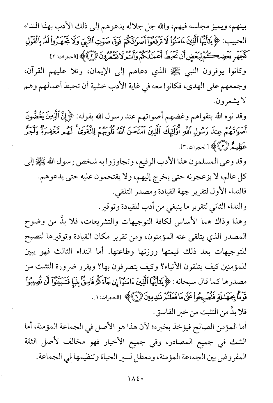 وهذا وذاك هما الأساس لكافة التوجيهات والتشريعات، فلا بدَّ من وضوح المصدر الذي يتلقى عنه المؤمنون، ومن تقرير مكان القيادة وتوقيرها لتصبح للتوجيهات بعد ذلك قيمتها ووزنها وطاعتها. أما النداء الثالث فهو يبين للمؤمنين كيف يتلقون الأنباء؟ وكيف يتصرفون بها؟ ويقرر ضرورة التثبت من مصدرها كما قال سبحانه: {يَاأَيُّهَا الَّذِينَ آمَنُوا إِنْ جَاءَكُمْ فَاسِقٌ بِنَبَإٍ فَتَبَيَّنُوا أَنْ تُصِيبُوا قَوْمًا بِجَهَالَةٍ فَتُصْبِحُوا عَلَى مَا فَعَلْتُمْ نَادِمِينَ (6)} [الحجرات: 6].