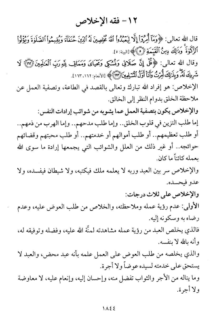 وقال الله تعالى: {قُلْ إِنَّ صَلَاتِي وَنُسُكِي وَمَحْيَايَ وَمَمَاتِي لِلَّهِ رَبِّ الْعَالَمِينَ (162) لَا شَرِيكَ لَهُ وَبِذَلِكَ أُمِرْتُ وَأَنَا أَوَّلُ الْمُسْلِمِينَ (163)} [الأنعام: 162، 163].
