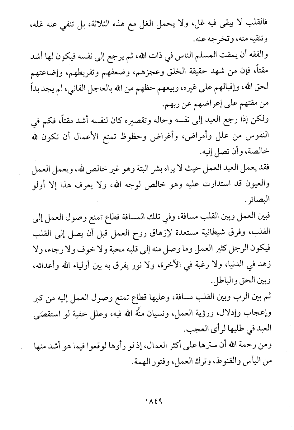 فبين العمل وبين القلب مسافة، وفي تلك المسافة قطاع تمنع وصول العمل إلى القلب، وفرق شيطانية مستعدة لإزهاق روح العمل قبل أن يصل إلى القلب فيكون الرجل كثير العمل وما وصل منه إلى قلبه محبة ولا خوف ولا رجاء، ولا زهد في الدنيا، ولا رغبة في الآخرة، ولا نور يفرق به بين أولياء الله وأعدائه، وبين الحق والباطل.