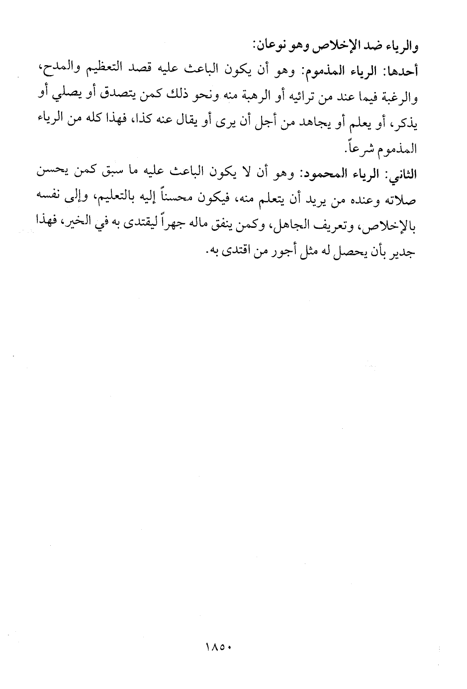 الثاني: الرياء المحمود: وهو أن لا يكون الباعث عليه ما سبق كمن يحسن صلاته وعنده من يريد أن يتعلم منه، فيكون محسناً إليه بالتعليم، وإلى نفسه بالإخلاص، وتعريف الجاهل، وكمن ينفق ماله جهراً ليقتدى به في الخير، فهذا جدير بأن يحصل له مثل أجور من اقتدى به.