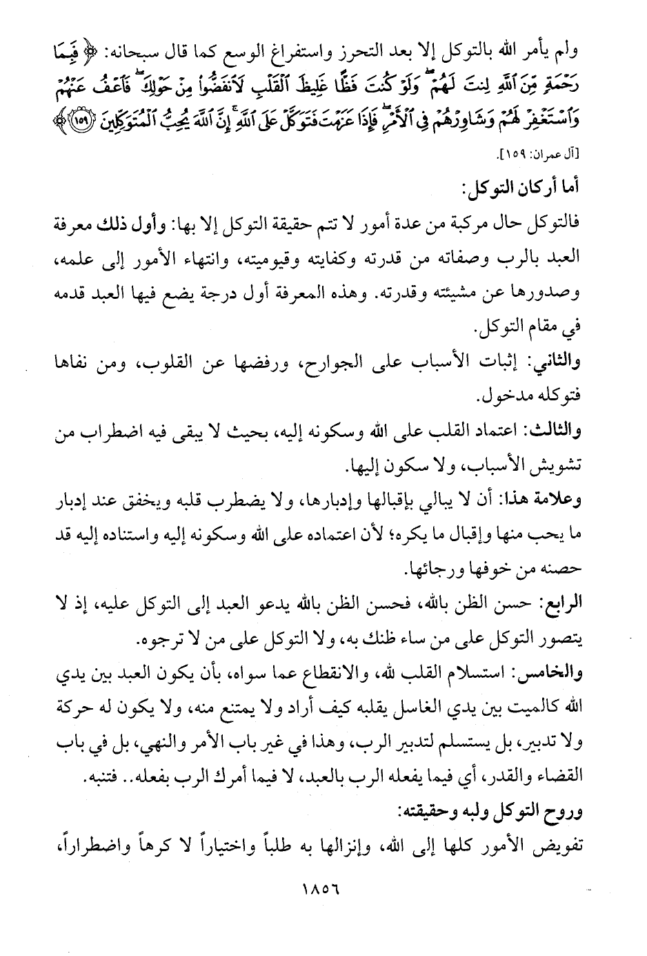 والثالث: اعتماد القلب على الله وسكونه إليه، بحيث لا يبقى فيه اضطراب من تشويش الأسباب، ولا سكون إليها.