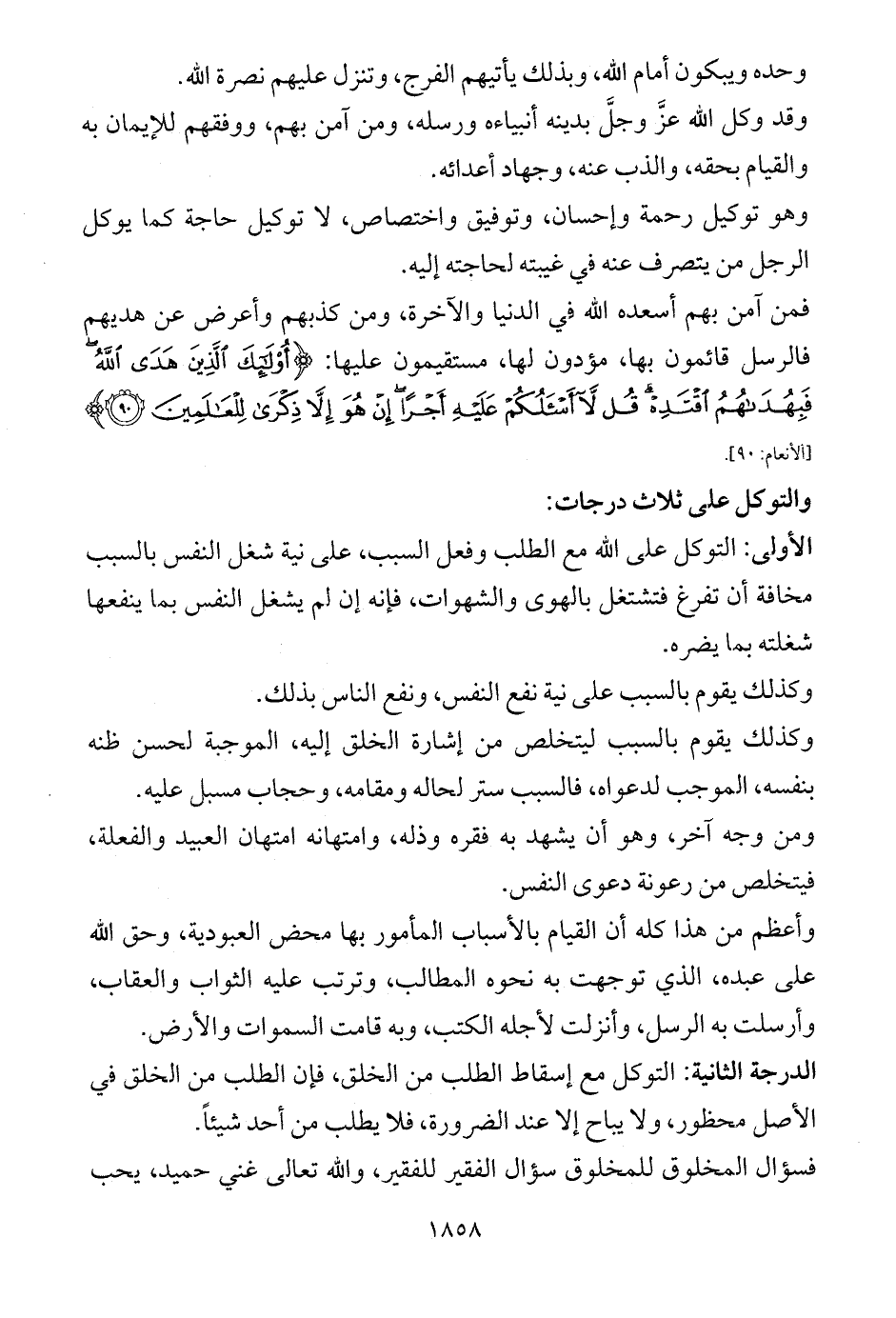 الأولى: التوكل على الله مع الطلب وفعل السبب، على نية شغل النفس بالسبب مخافة أن تفرغ فتشتغل بالهوى والشهوات، فإنه إن لم يشغل النفس بما ينفعها شغلته بما يضره.