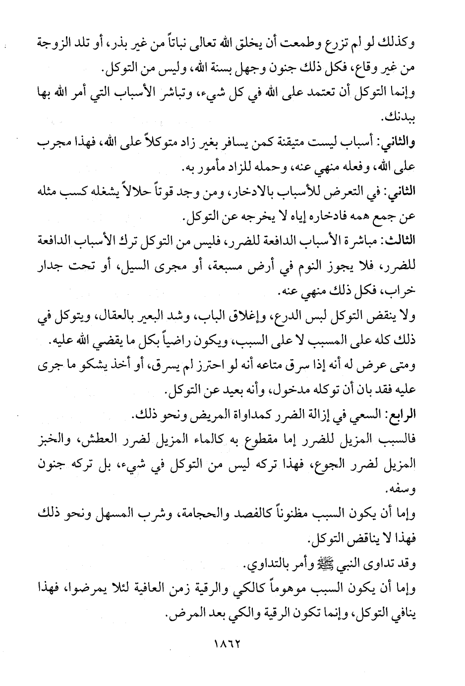 الثالث: مباشرة الأسباب الدافعة للضرر، فليس من التوكل ترك الأسباب الدافعة للضرر، فلا يجوز النوم في أرض مسبعة، أو مجرى السيل، أو تحت جدار خراب، فكل ذلك منهي عنه.