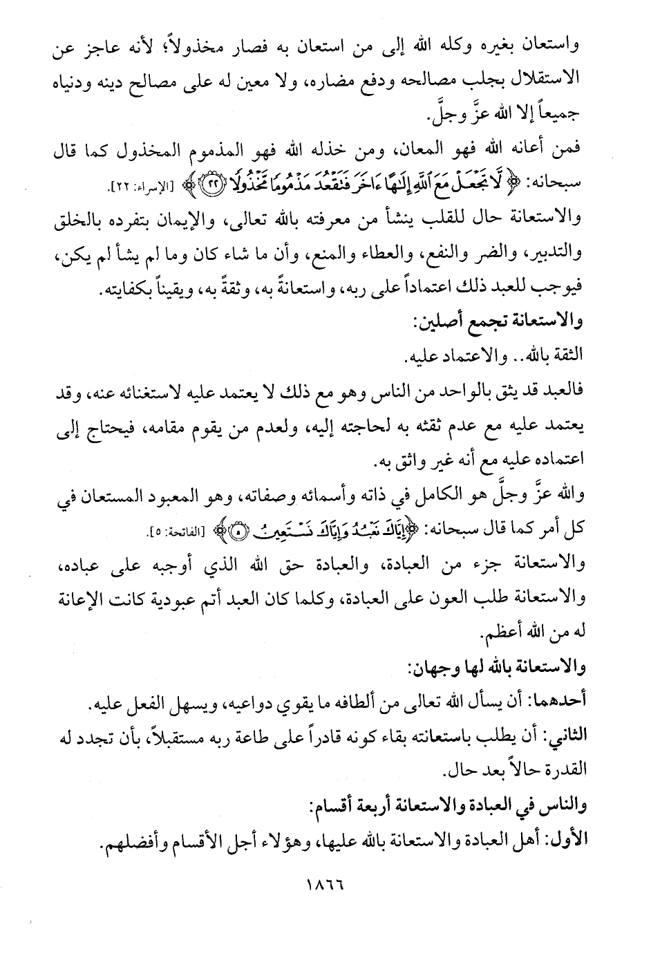والاستعانة حال للقلب ينشأ من معرفته بالله تعالى، والإيمان بتفرده بالخلق والتدبير، والضر والنفع، والعطاء والمنع، وأن ما شاء كان وما لم يشأ لم يكن، فيوجب للعبد ذلك اعتماداً على ربه، واستعانةً به، وثقةً به، ويقيناً بكفايته.