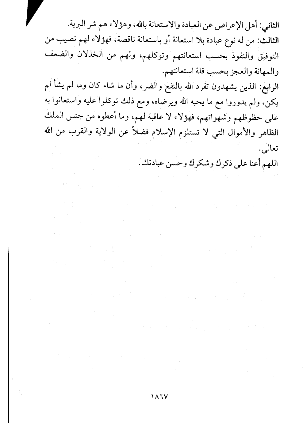الثالث: من له نوع عبادة بلا استعانة أو باستعانة ناقصة، فهؤلاء لهم نصيب من التوفيق والنفوذ بحسب استعانتهم وتوكلهم، ولهم من الخذلان والضعف والمهانة والعجز بحسب قلة استعانتهم.