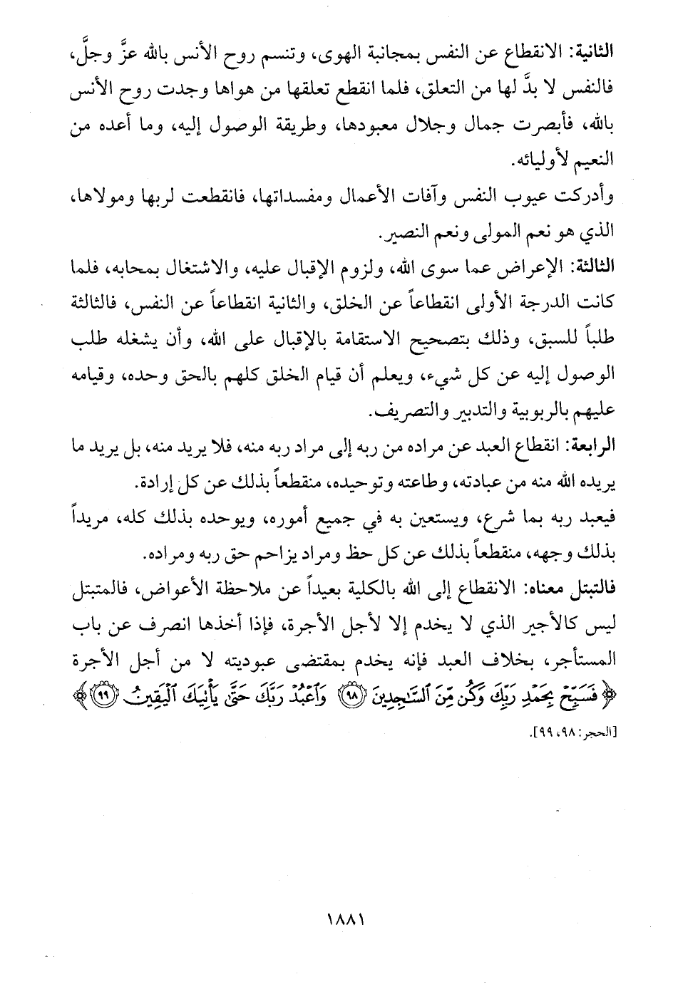 فالتبتل معناه: الانقطاع إلى الله بالكلية بعيداً عن ملاحظة الأعواض، فالمتبتل ليس كالأجير الذي لا يخدم إلا لأجل الأجرة، فإذا أخذها انصرف عن باب المستأجر، بخلاف العبد فإنه يخدم بمقتضى عبوديته لا من أجل الأجرة {فَسَبِّحْ بِحَمْدِ رَبِّكَ وَكُنْ مِنَ السَّاجِدِينَ (98) وَاعْبُدْ رَبَّكَ حَتَّى يَأْتِيَكَ الْيَقِينُ (99)} [الحجر: 98، 99].