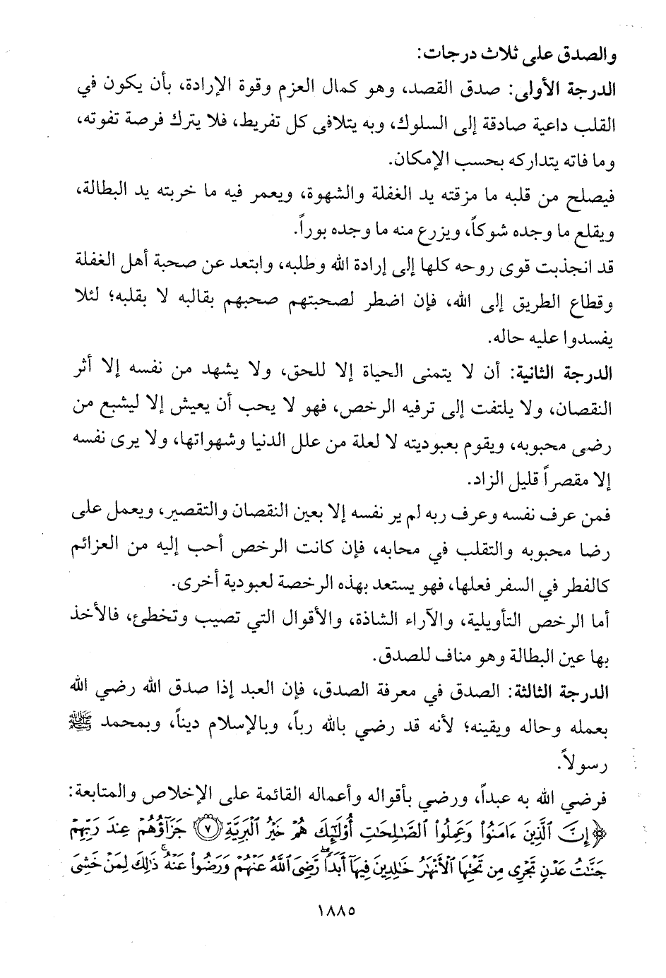 الدرجة الثالثة: الصدق في معرفة الصدق، فإن العبد إذا صدق الله رضي الله بعمله وحاله ويقينه؛ لأنه قد رضي بالله رباً، وبالإسلام ديناً، وبمحمد - صلى الله عليه وسلم - رسولاً.