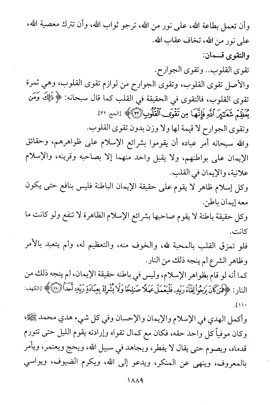 كما أنه لو قام بظواهر الإسلام، وليس في باطنه حقيقة الإيمان، لم ينجه ذلك من النار: {فَمَنْ كَانَ يَرْجُو لِقَاءَ رَبِّهِ فَلْيَعْمَلْ عَمَلًا صَالِحًا وَلَا يُشْرِكْ بِعِبَادَةِ رَبِّهِ أَحَدًا (110)} [الكهف: 110].