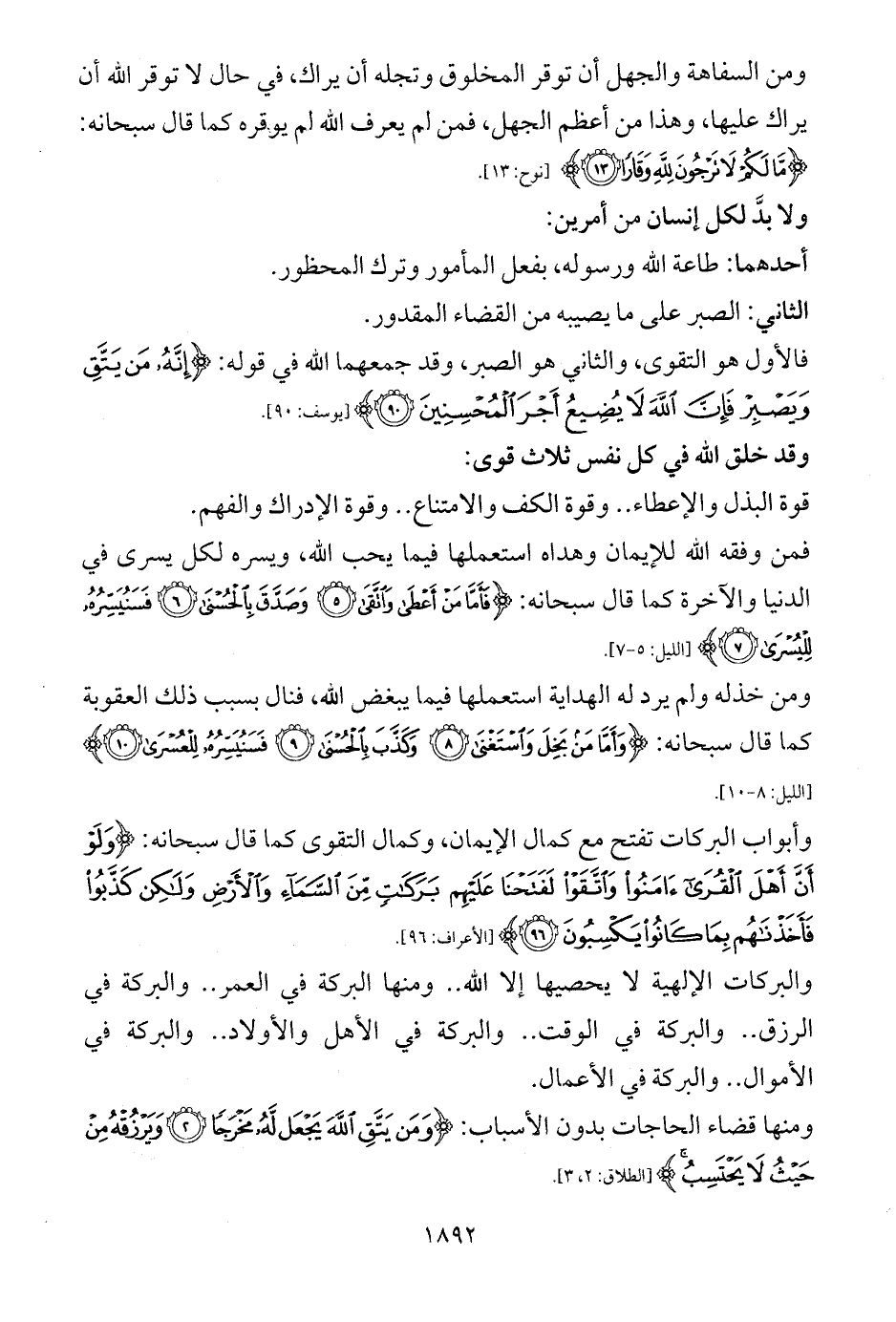 ومنها قضاء الحاجات بدون الأسباب: {وَمَنْ يَتَّقِ اللَّهَ يَجْعَلْ لَهُ مَخْرَجًا (2) وَيَرْزُقْهُ مِنْ حَيْثُ لَا يَحْتَسِبُ} [الطلاق: 2، 3].