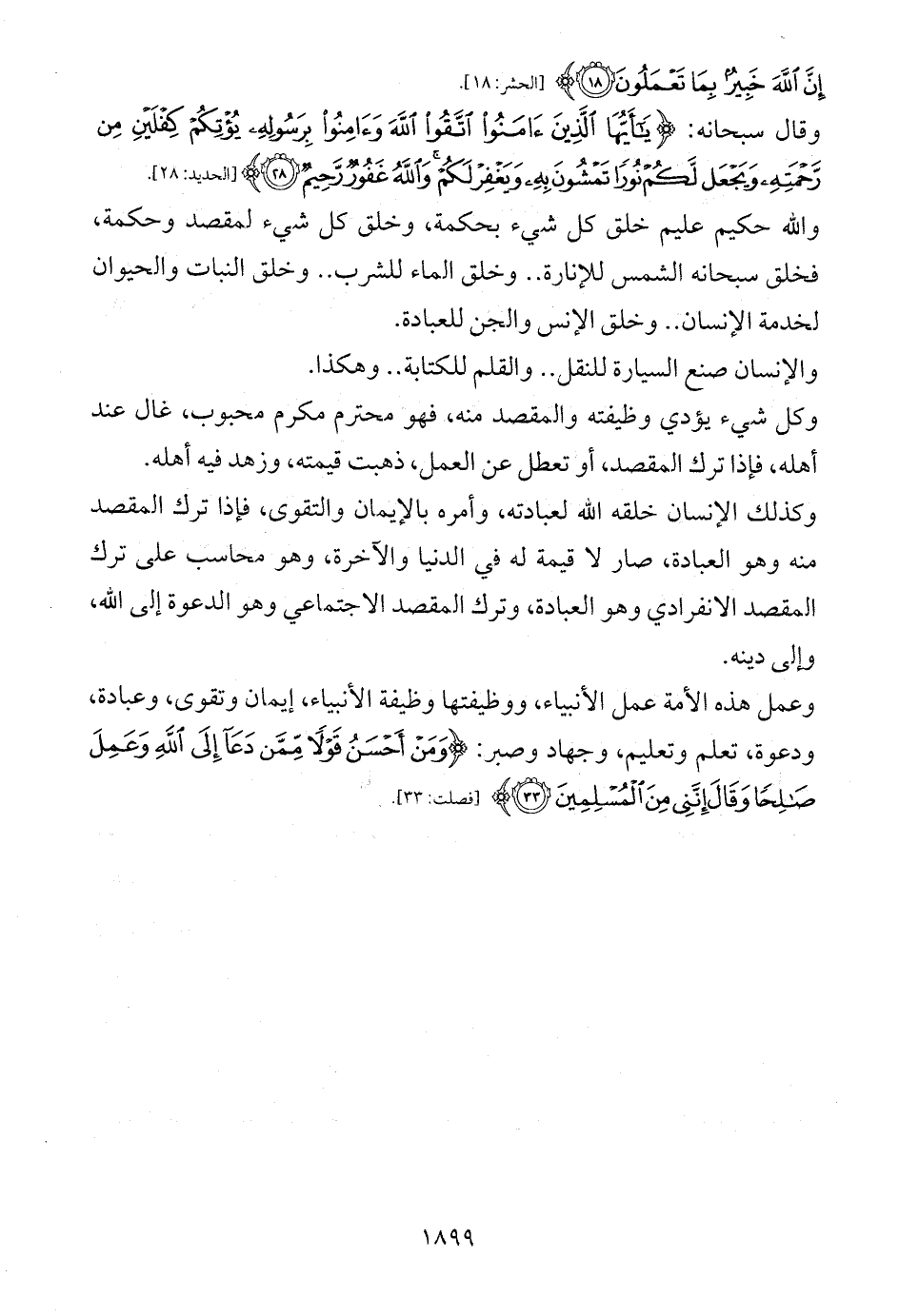 وكذلك الإنسان خلقه الله لعبادته، وأمره بالإيمان والتقوى، فإذا ترك المقصد منه وهو العبادة، صار لا قيمة له في الدنيا والآخرة، وهو محاسب على ترك المقصد الانفرادي وهو العبادة، وترك المقصد الاجتماعي وهو الدعوة إلى الله، وإلى دينه.
