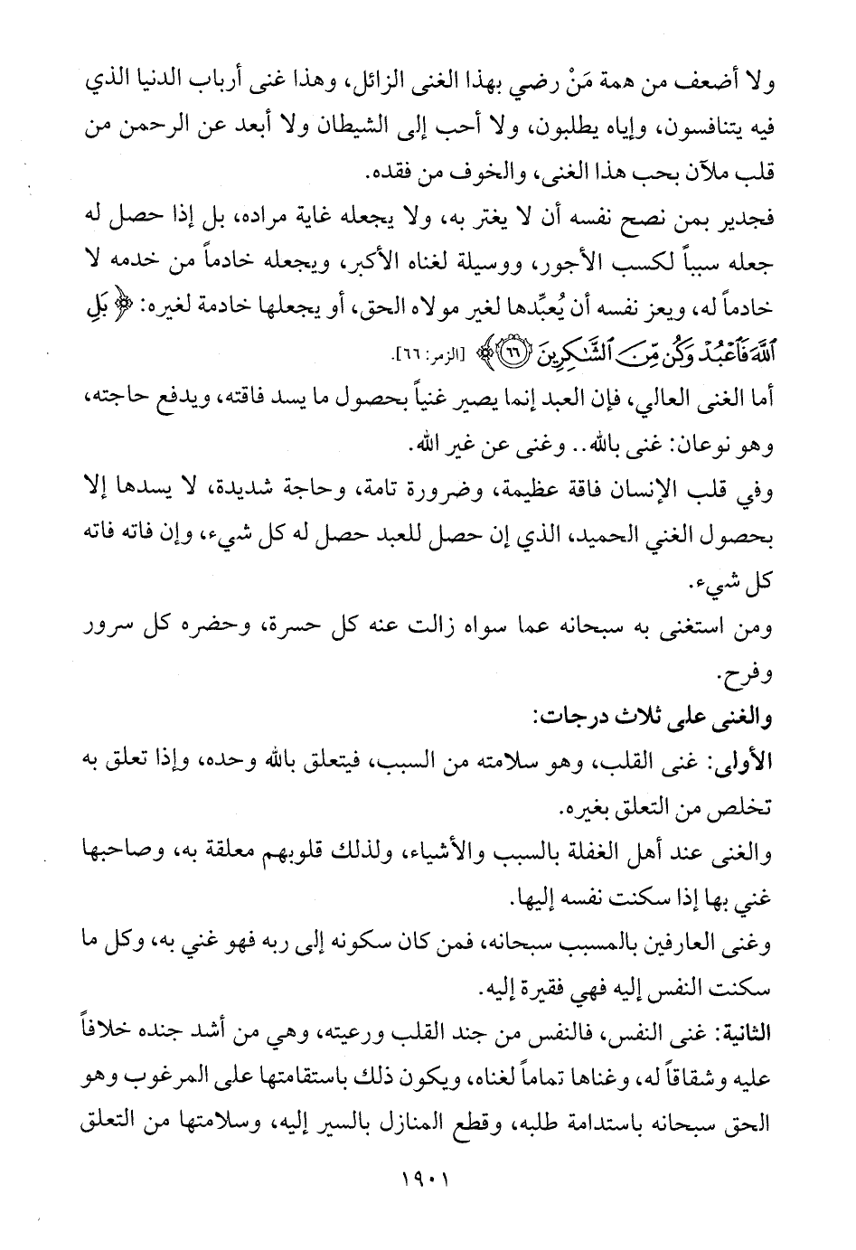 أما الغنى العالي، فإن العبد إنما يصير غنياً بحصول ما يسد فاقته، ويدفع حاجته، وهو نوعان: غنى بالله .. وغنى عن غير الله.