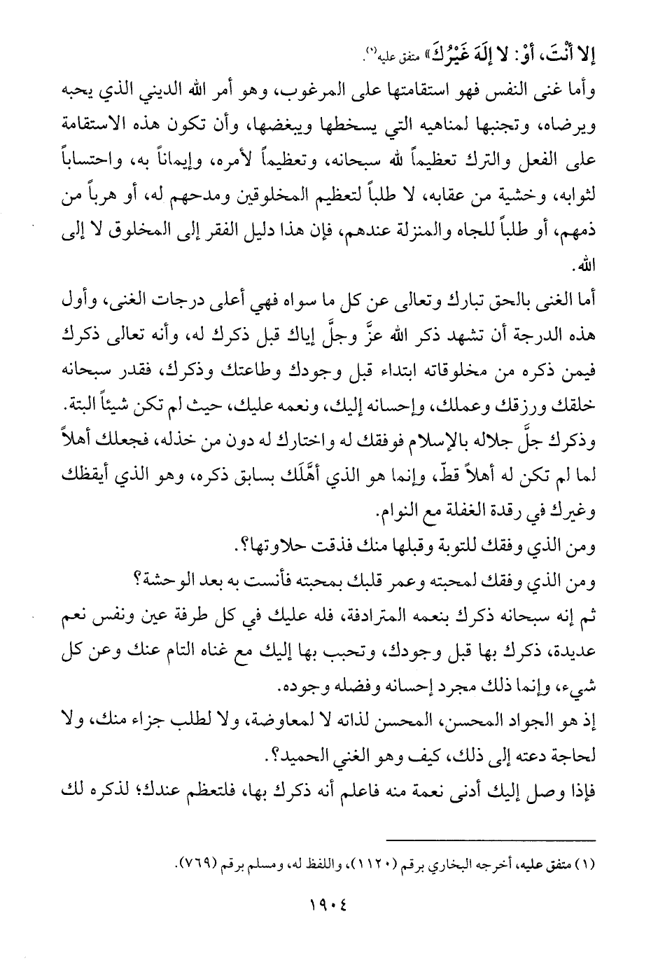 أما الغنى بالحق تبارك وتعالى عن كل ما سواه فهي أعلى درجات الغنى، وأول هذه الدرجة أن تشهد ذكر الله عزَّ وجلَّ إياك قبل ذكرك له، وأنه تعالى ذكرك فيمن ذكره من مخلوقاته ابتداء قبل وجودك وطاعتك وذكرك، فقدر سبحانه خلقك ورزقك وعملك، وإحسانه إليك، ونعمه عليك، حيث لم تكن شيئاً البتة.