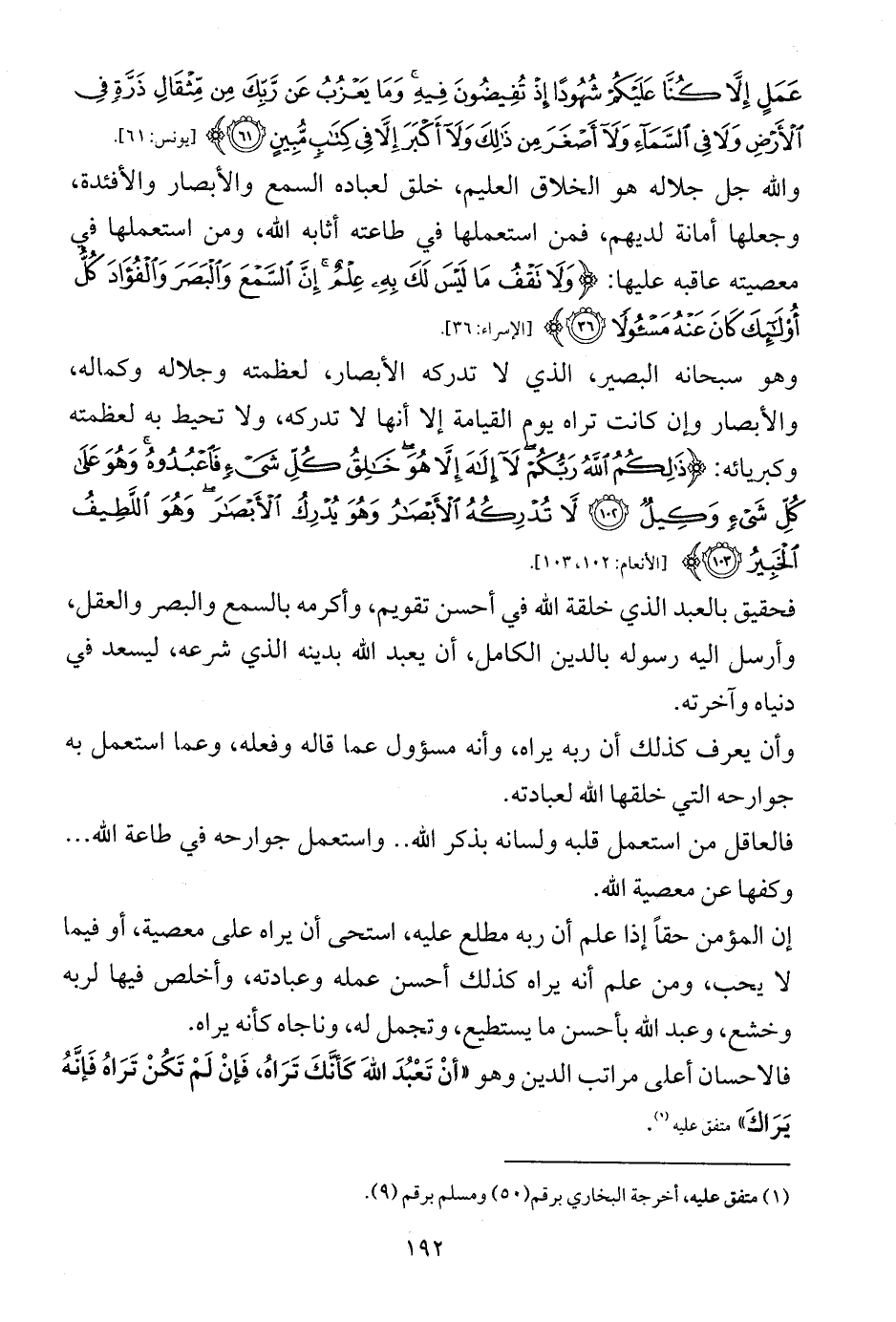 فالاحسان أعلى مراتب الدين وهو «أنْ تَعْبُدَ اللهَ كَأنَّكَ تَرَاهُ، فَإنْ لَمْ تَكُنْ تَرَاهُ فَإنَّهُ يَرَاكَ» متفق عليه (¬1).